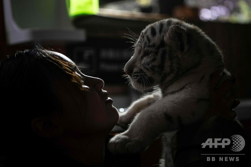 三つ子のホワイトタイガーの赤ちゃん、動物園で公開 中国・昆明