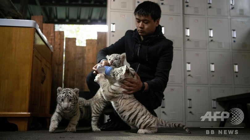 三つ子のホワイトタイガーの赤ちゃん、動物園で公開 中国・昆明