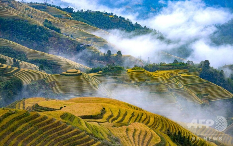 【10月20日 CNS】中国・広西チワン族自治区(Guangxi Zhuang Autonomous Region)桂林市(Guilin)竜勝各族自治県(Longsheng)の「龍脊棚田(Longji Rice Terraces)」と村落が、雲に覆われていた。(c)CNS/JCM/AFPBB News
