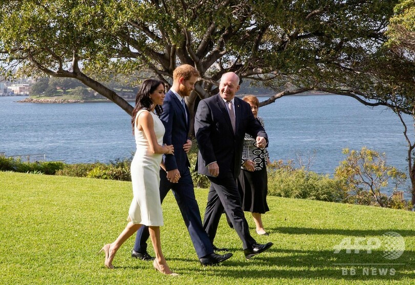 王子夫妻はオーストラリア総督夫妻の歓迎を受け、シドニー・オペラハウス(Sydney Opera House)を背景に写真撮影に臨んだ。白のタイトドレスを着用したメーガン妃に、妊娠の兆候は見られなかったが、総督夫妻から早くもフットウエアブランド「UGG(アグ)」の赤ちゃん用ブーツをプレゼントされて、メーガン妃が笑顔を見せる一幕もあった。