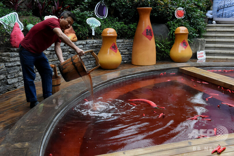 温泉の「鍋の素」には、鶏血藤、紅花、何首烏などの中国伝統薬と赤ワインが入っていて、身体に良いとされている。また温泉の浴槽にはトウガラシも浮かんでおり、周囲には火鍋に使うタレや酒などのオブジェも設置されている。(c)CNS/JCM/AFPBB News