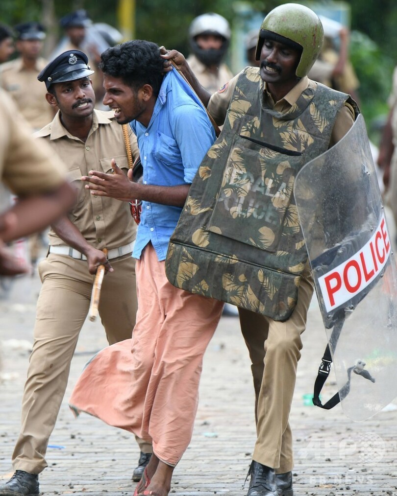 【10月18日 AFP】インド南部ケララ(Kerala)州のヒンズー教寺院付近で17日、強硬派ヒンズー教徒が女性の入場を阻止した際に衝突が起き、警棒を振りかざした警官が石を投げる抗議参加者に突撃する事態が発生した。
