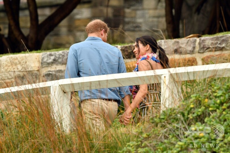 【10月19日 AFP】オセアニア歴訪中のヘンリー英王子(Prince Harry)とメーガン妃(Meghan, Duchess of Sussex)は19日、オーストラリア・シドニーのボンダイビーチ(Bondi Beach)を訪れ、南国の花飾りを身に着けてはだしでビーチを歩いた。