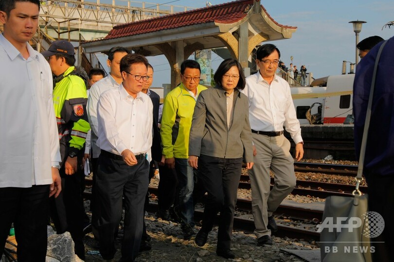 【10月22日 AFP】(写真追加)台湾の蔡英文(Tsai Ing-wen)総統は22日、北東部の宜蘭(Yilan)県で前日起きた特急列車脱線事故の現場を視察し、事故原因の迅速な究明を指示した。台湾の鉄道事故としては27年ぶり最悪の被害となった今回の事故では、これまでに18人が死亡、187人が負傷している。