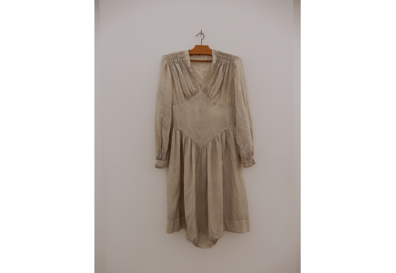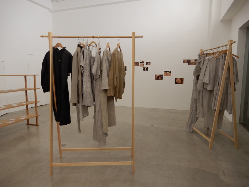 今回染められたのは写真だけではない。ライフワークとしてエレンが集めている古着の一部をCOSMIC WONDERが墨で染め、場合によっては別のパーツを組み合わせるなどしてリメイクした。COSMIC WONDERの前田征紀は「墨は松や木々などを燃やした煤である それらは生命を焼失することで煤へと変わる」、また今回のコラボレーションは「収集した古着から焼失した気配を感じるための試み」だという。
