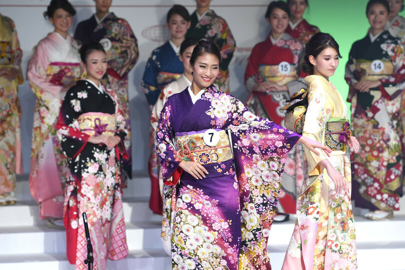 この日の「日本代表選出大会」には、モデルや大学生のほか、元自衛官や球場の販売員などさまざまな経歴を持つファイナリスト32人が出場。着物や水着、ドレス姿を披露した。