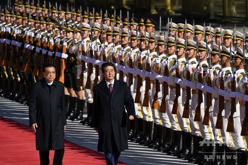【10月26日 AFP】中国を公式訪問中の安倍晋三(Shinzo Abe)首相は26日、首都北京の人民大会堂(Great Hall of the People)前で行われた歓迎式典に出席し、李克強(Li Keqiang)首相と共に儀仗(ぎじょう)兵を閲兵した。