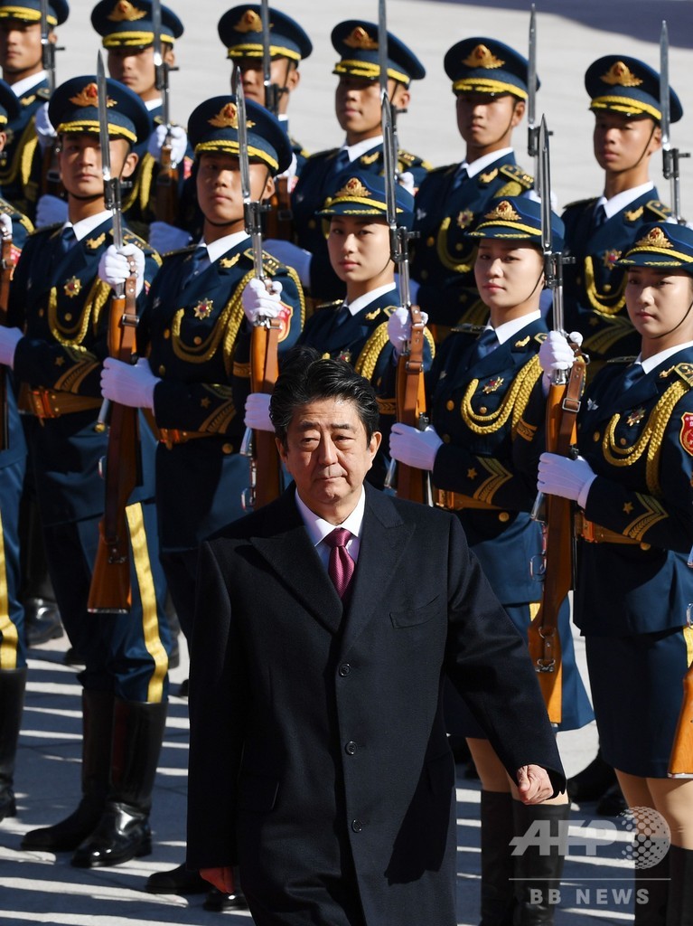中国訪問中の安倍首相、歓迎式典で儀仗兵を閲兵