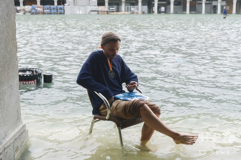 ベネチアでは旅行者らが雨でずぶぬれになる中、サンマルコ広場(St Mark's Square) が立ち入り禁止となった。地元当局は、同広場の水位は昼過ぎまでに156センチに達したとしている。