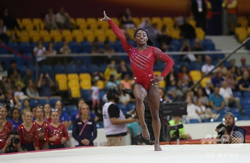 21歳という年齢にして通算11個目の世界タイトルを獲得したバイルスは、今大会でさらに2つの金メダルを手にすると、世界体操における通算タイトル数は13となり、男女通して史上最多の記録となる。(c)AFP