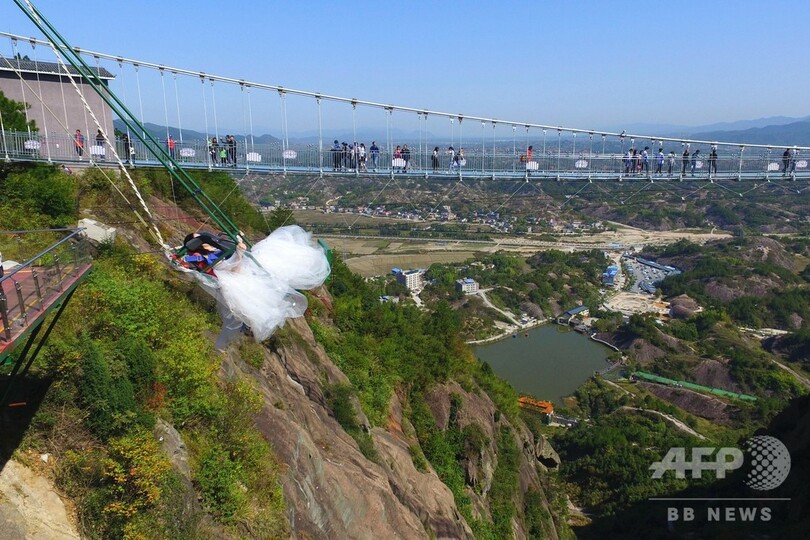 赤いウエンデングトレスと白いウエディングドレスを身に着けた2人は、崖の上にあるブランコに乗り、空中をゆらゆらと揺れていた。その美しさとスリルの富んだ映像に、訪れた多くの人たちの注目を集めていた。(c)CNS/JCM/AFPBB News