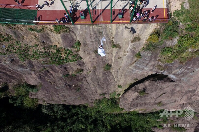 赤いウエンデングトレスと白いウエディングドレスを身に着けた2人は、崖の上にあるブランコに乗り、空中をゆらゆらと揺れていた。その美しさとスリルの富んだ映像に、訪れた多くの人たちの注目を集めていた。(c)CNS/JCM/AFPBB News