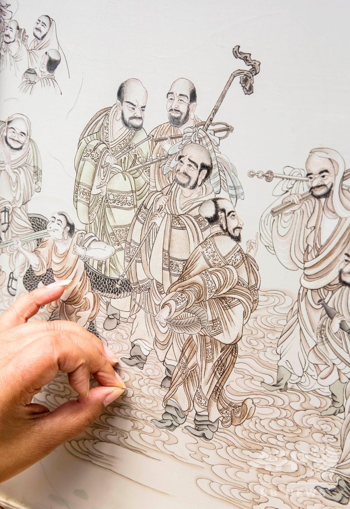 近年、江蘇省東台市はこの伝統芸術をさらに発展させ、髪繍の設計から配色、刺繍、装幀に至る産業チェーンを作り上げた。刺繍技術についても開発と創造を続け、「墨繍(単色)」から「彩繍(彩色)」、片面刺繍から両面刺繍へと発展させ、現在さらに新しい「両面異色刺繍」を創り出した。作品テーマは広範にわたり、精密な製作技術により、100を超える国と地域に輸出されている。(c)CNS/JCM/AFPBB News