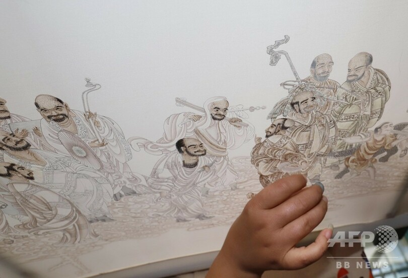 近年、江蘇省東台市はこの伝統芸術をさらに発展させ、髪繍の設計から配色、刺繍、装幀に至る産業チェーンを作り上げた。刺繍技術についても開発と創造を続け、「墨繍(単色)」から「彩繍(彩色)」、片面刺繍から両面刺繍へと発展させ、現在さらに新しい「両面異色刺繍」を創り出した。作品テーマは広範にわたり、精密な製作技術により、100を超える国と地域に輸出されている。(c)CNS/JCM/AFPBB News