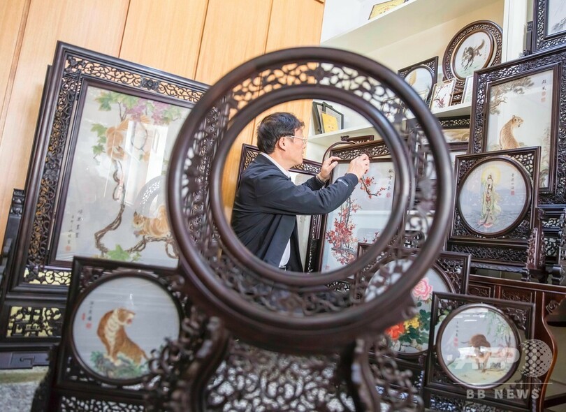 近年、江蘇省東台市はこの伝統芸術をさらに発展させ、髪繍の設計から配色、刺繍、装幀に至る産業チェーンを作り上げた。刺繍技術についても開発と創造を続け、「墨繍(単色)」から「彩繍(彩色)」、片面刺繍から両面刺繍へと発展させ、現在さらに新しい「両面異色刺繍」を創り出した。作品テーマは広範にわたり、精密な製作技術により、100を超える国と地域に輸出されている。(c)CNS/JCM/AFPBB News