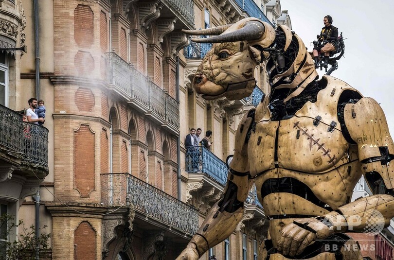 【11月4日 AFP】フランス南部トゥールーズ(Toulouse)で2日、牛の頭と人の体を持つギリシャ神話の怪物ミノタウロス「アステリオン(Asterion)」と、巨大なクモの「アリアーヌ(Ariane)」(ギリシャ神話の「アリアドネ」)が市庁舎前広場に現れた。