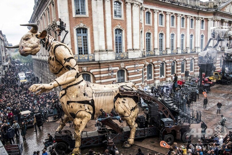 【11月4日 AFP】フランス南部トゥールーズ(Toulouse)で2日、牛の頭と人の体を持つギリシャ神話の怪物ミノタウロス「アステリオン(Asterion)」と、巨大なクモの「アリアーヌ(Ariane)」(ギリシャ神話の「アリアドネ」)が市庁舎前広場に現れた。