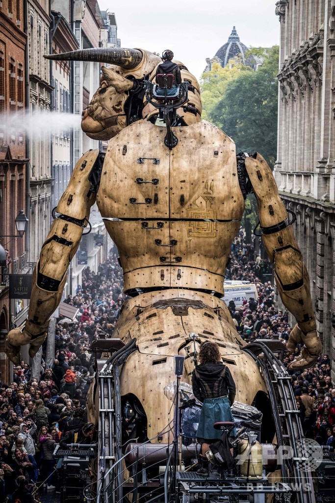 機械仕掛けで動く巨大アステリオンとアリアーヌは、街頭演劇グループ「ラ・マシーヌ(La Machine)」によるショー「神殿の守護者」の一環として登場。市内を練り歩いて市民を興奮させた。(c)AFP