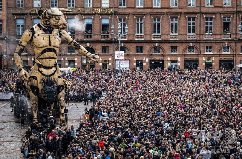 【11月4日 AFP】フランス南部トゥールーズ(Toulouse)で2日、牛の頭と人の体を持つギリシャ神話の怪物ミノタウロス「アステリオン(Asterion)」と、巨大なクモの「アリアーヌ(Ariane)」(ギリシャ神話の「アリアドネ」)が市庁舎前広場に現れた。