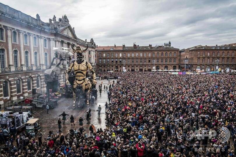 【11月4日 AFP】フランス南部トゥールーズ(Toulouse)で2日、牛の頭と人の体を持つギリシャ神話の怪物ミノタウロス「アステリオン(Asterion)」と、巨大なクモの「アリアーヌ(Ariane)」(ギリシャ神話の「アリアドネ」)が市庁舎前広場に現れた。