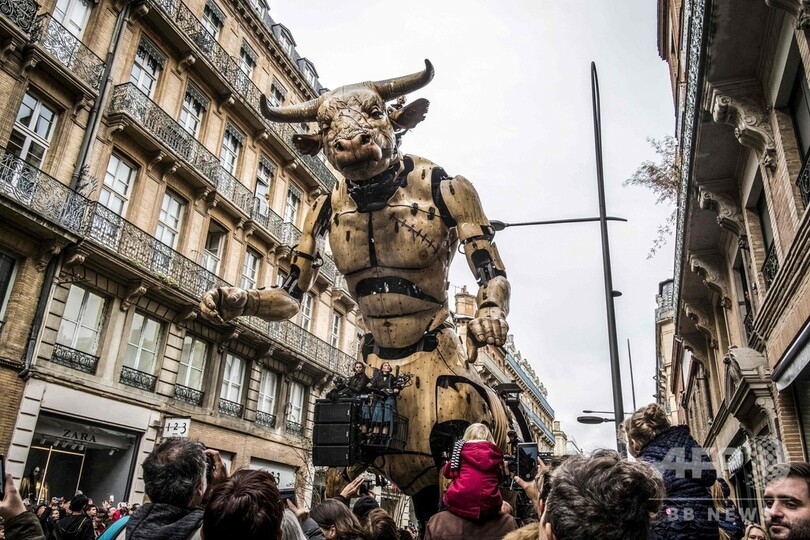 【11月4日 AFP】フランス南部トゥールーズ(Toulouse)で2日、牛の頭と人の体を持つギリシャ神話の怪物ミノタウロス「アステリオン(Asterion)」と、巨大なクモの「アリアーヌ(Ariane)」(ギリシャ神話の「アリアドネ」)が市庁舎前広場に現れた。