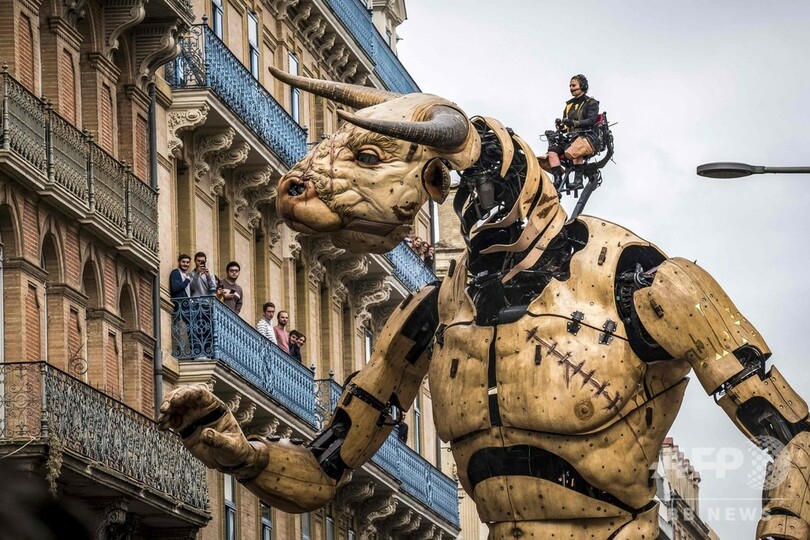 【11月4日 AFP】フランス南部トゥールーズ(Toulouse)で2日、牛の頭と人の体を持つギリシャ神話の怪物ミノタウロス「アステリオン(Asterion)」と、巨大なクモの「アリアーヌ(Ariane)」(ギリシャ神話の「アリアドネ」)が市庁舎前広場に現れた。