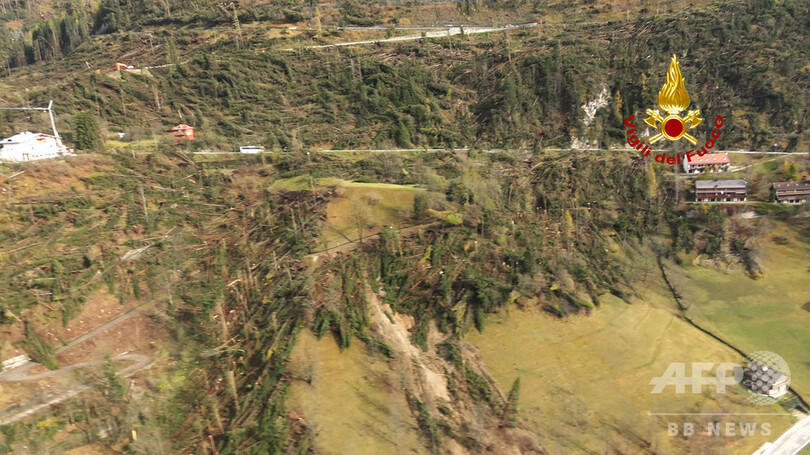 同国北部のベネト(Veneto)州では1日、暴風が吹き荒れ、ドロミーティ(Dolomites)山地を覆う木々がマッチ棒のようになぎ倒された。