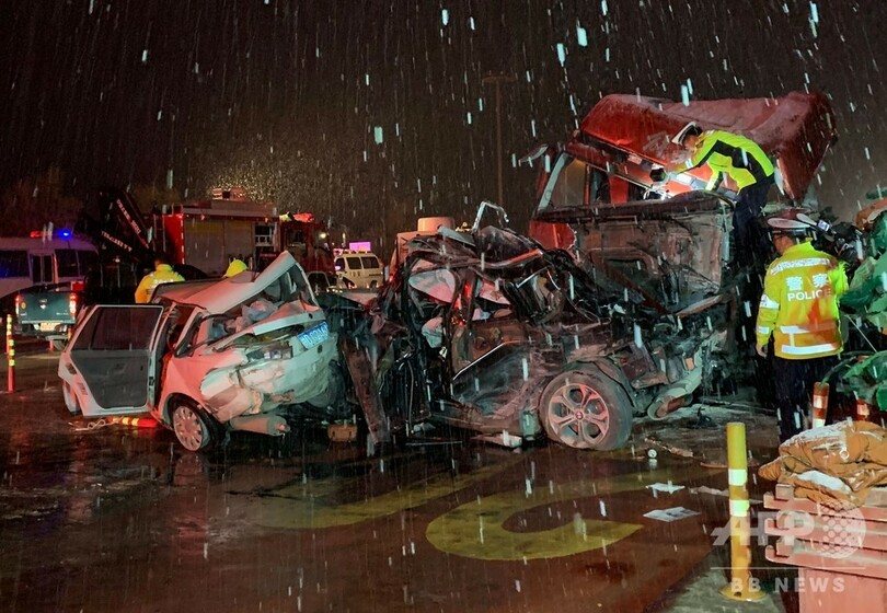 中国中央テレビ(CCTV)の映像には、雪が舞う中で車体がねじ曲がったり、損傷したりした多数の車両が映っている。(c)AFP
