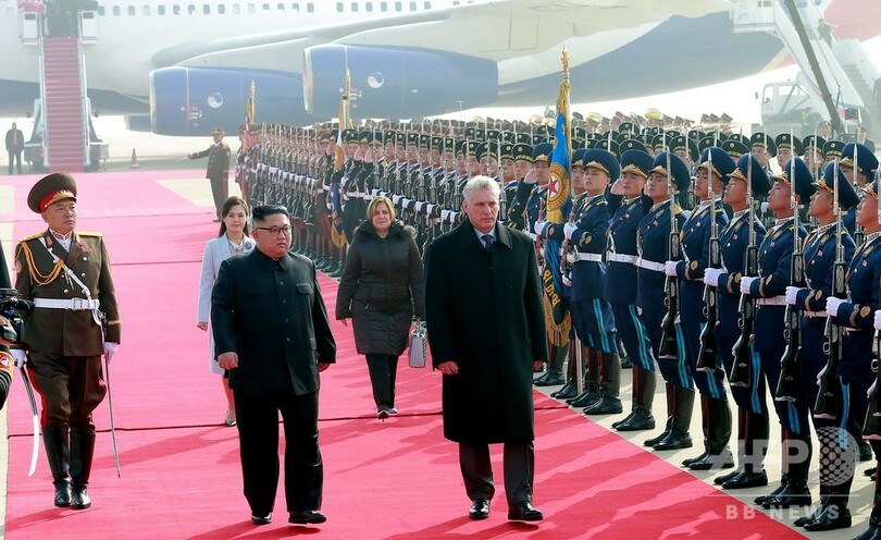 ディアスカネル氏は4日に平壌空港(Pyongyang International Airport)に到着。金氏と李雪主(リ・ソルジュ、Ri Sol-Ju)夫人による出迎えのほか、21発の祝砲や夕食会、歓迎コンサートといったもてなしを受けた。