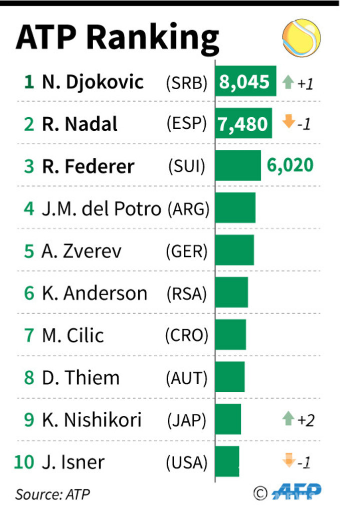 一方、4日に行われたパリ・マスターズ(Rolex Paris Masters 2018)決勝でジョコビッチを破り、驚きの優勝を果たしたカレン・カチャノフ(Karen Khachanov、ロシア)は順位を7つ上げて11位に上昇。錦織圭(Kei Nishikori)は、前週から2ランクアップでトップ10入りを果たしている。(c)AFP