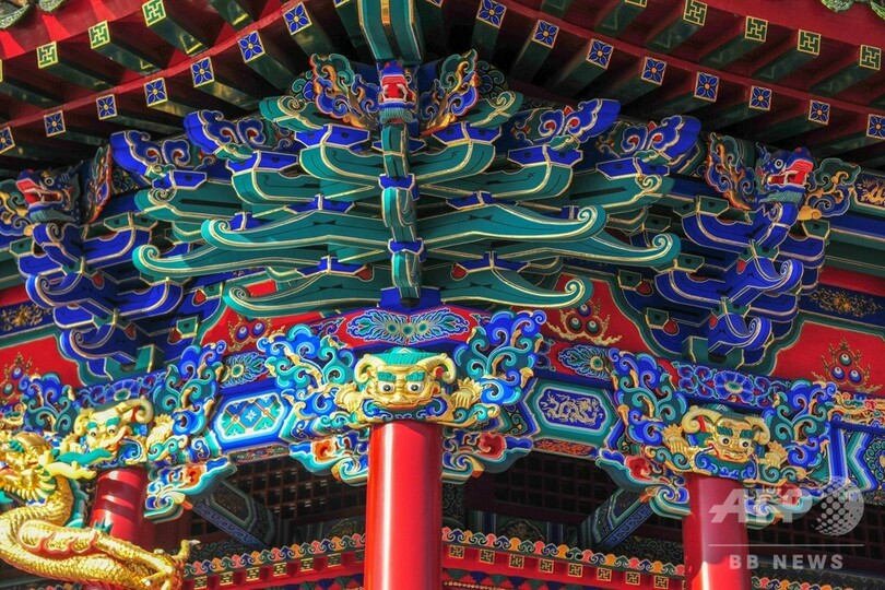【11月13日 CNS】中国・遼寧省(Liaoning)瀋陽(Shenyang)にある瀋陽故宮博物院(The Shenyang Palace Museum)内にある大政殿(Dazhengdian)の金箔の貼り換え工程など、博物院にある歴史的建造物の装飾画の修復・保護作業がすべて終了した。(c)CNS/JCM/AFPBB News