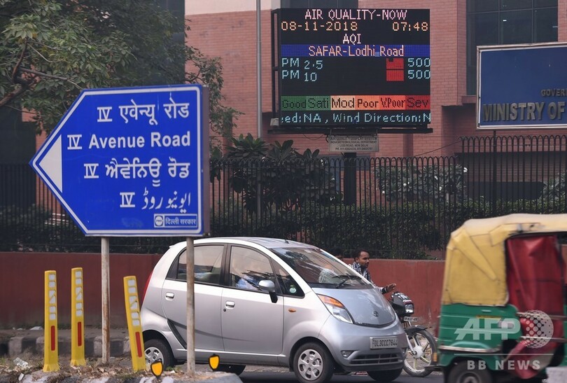 大気汚染レベルを独自に計測している在印米大使館は、大気汚染指数が595に達したと発表。この指数が100を超えると極めて有害で、健康な人にとっても危険なレベルとみなされる。同日の英ロンドンで41、仏パリでは52で、ニューデリーでの指数の高さが突出していることが分かる。(c)AFP