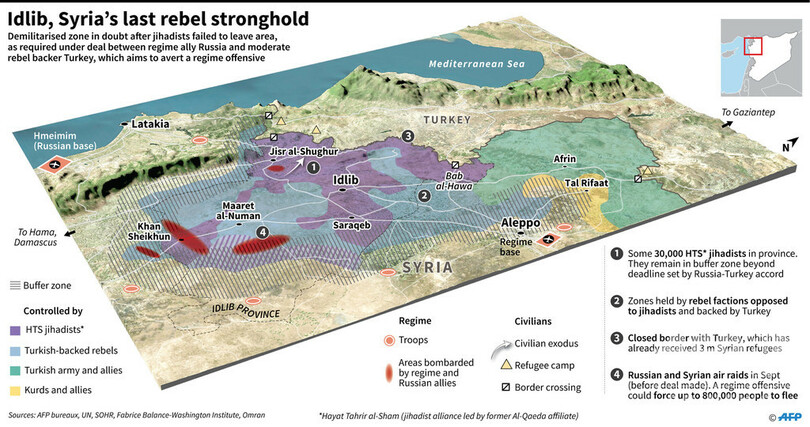 政府軍はこの支配地域に対する攻撃を警告していたが、ロシア政府と反体制派を支援するトルコ政府が9月、同地域周辺に非武装地帯を設置することで合意した。現在、同地域には約300万人が暮らしている。