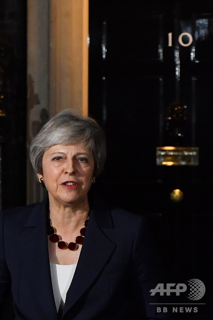 テリーザ・メイ(Theresa May)首相は、5時間以上に及んだ閣議の終了後、首相官邸前で会見し、「内閣は政府が離脱協定案と政治宣言の概要に同意すべきという共同決定を下した」と述べた。(c)AFP