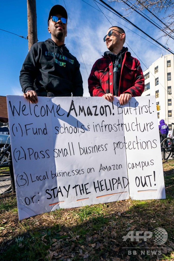 【11月15日 AFP】インターネット通販最大手の米アマゾン・ドットコム(Amazon.com)が第2本社をニューヨークと首都ワシントン郊外の2か所に分割して建設すると発表したことを受け、ニューヨーク市クイーンズ(Queens)地区で14日、100人近くの人が同社の本社建設に抗議するデモを行った。ニューヨーク市当局者によると、同社の誘致をめぐっては市側が30億ドル(約3400億円)近い税制優遇措置を持ち掛けたといい、デモ参加者たちからは地域の高級化による居住者の追い出しにつながりかねないとの批判の声が上がった。