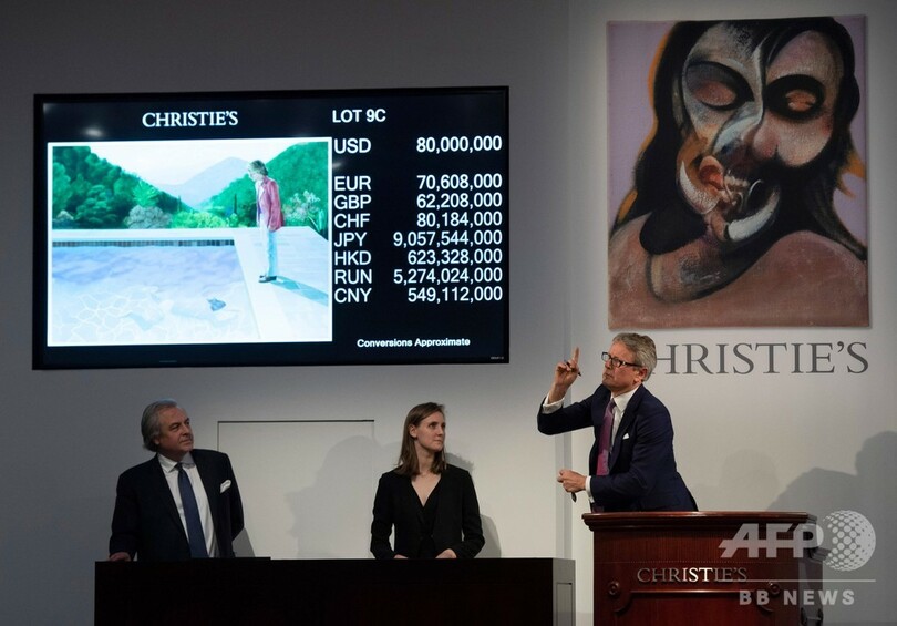 落札されたのはホックニー氏が1972年に制作した代表作「芸術家の肖像画―プールと2人の人物―(Portrait of an Artist (Pool with Two Figures))」。クリスティーズによると「現代の最高傑作の一つ」で、予想落札価格は8000万ドル(約90億円)だった。競売では2人の電話入札者が9分以上にわたり、入札合戦を繰り広げた。