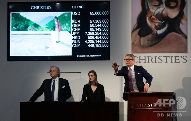 落札されたのはホックニー氏が1972年に制作した代表作「芸術家の肖像画―プールと2人の人物―(Portrait of an Artist (Pool with Two Figures))」。クリスティーズによると「現代の最高傑作の一つ」で、予想落札価格は8000万ドル(約90億円)だった。競売では2人の電話入札者が9分以上にわたり、入札合戦を繰り広げた。