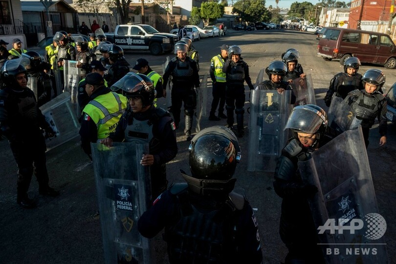 米国境に接するメキシコ北部の町ティフアナ(Tijuana)で25日、主にホンジュラスから米国を目指して移動してきた移民集団約5000人のうち成人男女と子どもから成る約500人が、米カリフォルニア州サンディエゴ(San Diego)に入ろうと強行突破を試み、さびの浮いた金属製フェンスをよじ登り、コンクリートで固められた川床に大挙して侵入した。