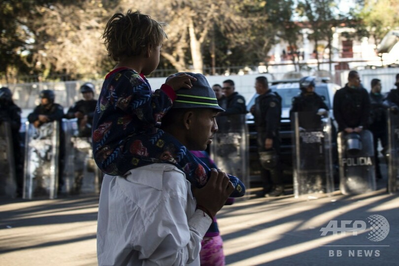 米国境に接するメキシコ北部の町ティフアナ(Tijuana)で25日、主にホンジュラスから米国を目指して移動してきた移民集団約5000人のうち成人男女と子どもから成る約500人が、米カリフォルニア州サンディエゴ(San Diego)に入ろうと強行突破を試み、さびの浮いた金属製フェンスをよじ登り、コンクリートで固められた川床に大挙して侵入した。