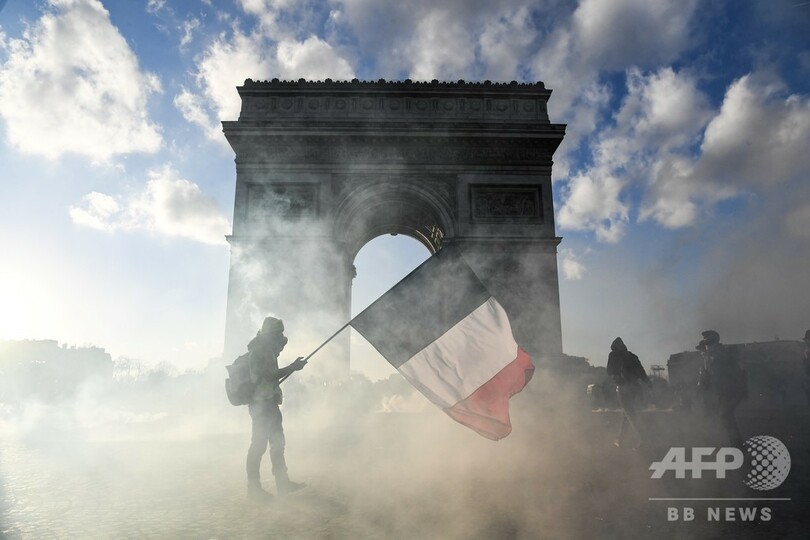 【3月28日 AFP】フランスで広がる「ジレ・ジョーヌ(黄色いベスト、gilets jaunes)」運動の参加者と警官が衝突する中、催涙ガスが立ち込めるパリの凱旋(がいせん)門(Arc de Triomphe)前を国旗を掲げて歩くデモ参加者。(c)AFP
