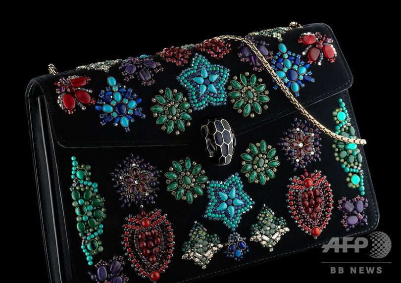 今回「セルペンティ」シリーズから特別に登場するのは、ジュエルとバッグの二面性を兼ね備えたオートクチュールのハンドバッグ。50年代ブルガリのブローチからインスピレーションを受け、ラピスラズリ、マラカイト、ターコイズ、スワロフスキークリスタルなどを用いて細かくデザインが再現された。個々のジュエルは歴史あるマニュファクチャーの技法により手作業で縫いつけられている。
