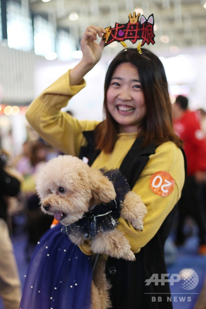 【12月6日 CNS】中国・江蘇省(Jiangsu)南京市(Nanjing)南京国際博覧中心(Nanjing International Expo Center)でこのほど、2018年中国(南京)寵物文化節が開催され、約100匹のさまざまな種類の犬が赤いじゅうたんの上を通って集団結婚式を行った。(c)CNS/JCM/AFPBB News