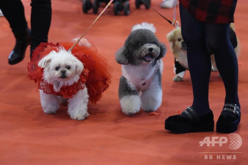 【12月6日 CNS】中国・江蘇省(Jiangsu)南京市(Nanjing)南京国際博覧中心(Nanjing International Expo Center)でこのほど、2018年中国(南京)寵物文化節が開催され、約100匹のさまざまな種類の犬が赤いじゅうたんの上を通って集団結婚式を行った。(c)CNS/JCM/AFPBB News