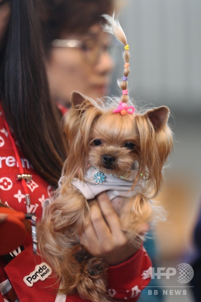 【12月6日 CNS】中国・江蘇省(Jiangsu)南京市(Nanjing)南京国際博覧中心(Nanjing International Expo Center)でこのほど、2018年中国(南京)寵物文化節が開催され、約100匹のさまざまな種類の犬が赤いじゅうたんの上を通って集団結婚式を行った。(c)CNS/JCM/AFPBB News