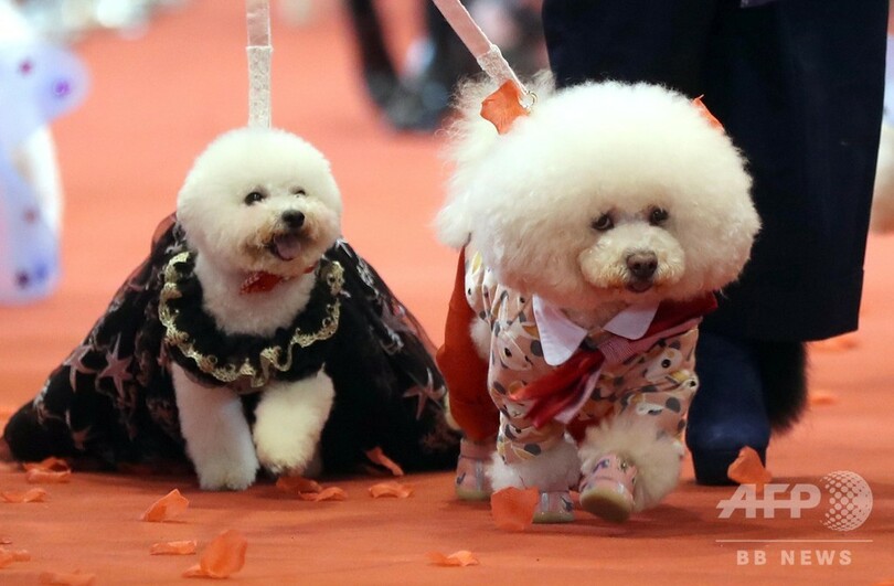 【12月6日 CNS】中国・江蘇省(Jiangsu)南京市(Nanjing)南京国際博覧中心(Nanjing International Expo Center)でこのほど、2018年中国(南京)寵物文化節が開催され、約100匹のさまざまな種類の犬が赤いじゅうたんの上を通って集団結婚式を行った。(c)CNS/JCM/AFPBB News
