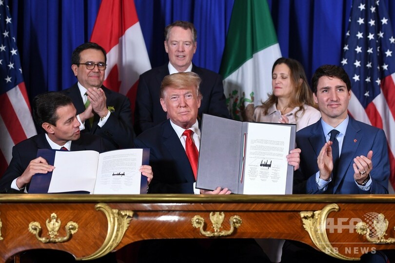 【12月1日 AFP】米国とメキシコ、カナダの3か国首脳は30日、北米自由貿易協定(NAFTA)に代わる新貿易協定「米・メキシコ・カナダ協定(USMCA)」に署名した。ドナルド・トランプ(Donald Trump)米大統領は、NAFTAが米国の雇用を喪失させていると批判していた。