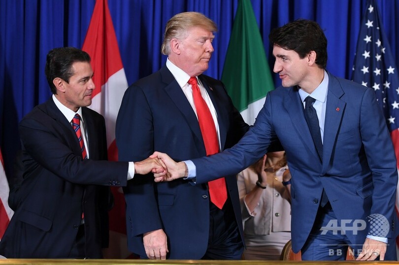 【12月1日 AFP】米国とメキシコ、カナダの3か国首脳は30日、北米自由貿易協定(NAFTA)に代わる新貿易協定「米・メキシコ・カナダ協定(USMCA)」に署名した。ドナルド・トランプ(Donald Trump)米大統領は、NAFTAが米国の雇用を喪失させていると批判していた。