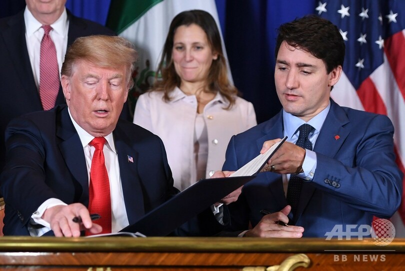【12月1日 AFP】米国とメキシコ、カナダの3か国首脳は30日、北米自由貿易協定(NAFTA)に代わる新貿易協定「米・メキシコ・カナダ協定(USMCA)」に署名した。ドナルド・トランプ(Donald Trump)米大統領は、NAFTAが米国の雇用を喪失させていると批判していた。
