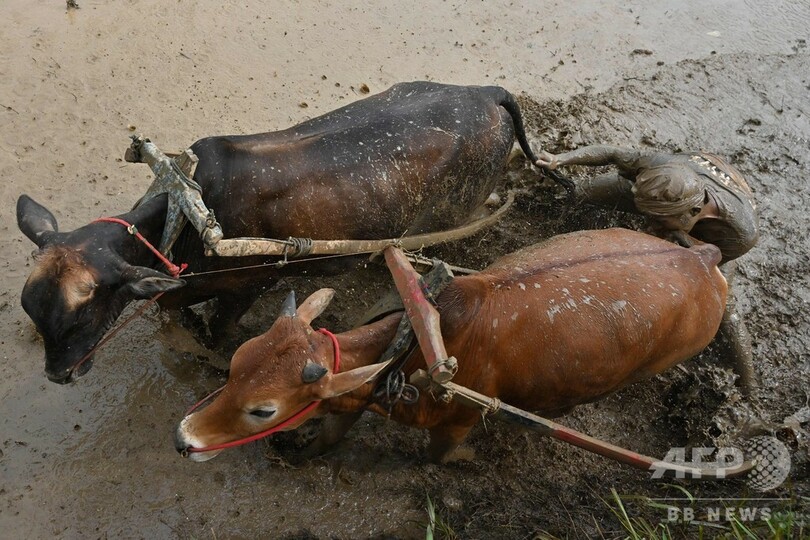 ニュース ライフ 泥を浴びてもしっぽを離すな! インドネシア伝統の牛レース 2018年12月2日 20:37 発信地:パリアンガン/インドネシア [ インドネシア アジア・オセアニア ] このニュースをシェア ‹ › ❮ 19/21 ❯ インドネシア西部スマトラ島のプリアンガンで行われた伝統の牛レース「パチュジャウィ」(2018年12月1日撮影)。(c)ADEK BERRY / AFP 画像作成中 ! 【12月2日 AFP】インドネシア西部スマトラ(Sumatra)島のパリアンガン(Pariangan)で1日、泥だらけの水田を駆け抜ける、100年の歴史を誇る伝統の牛レース「パチュジャウィ(pacu jawi)」が行われた。 米の収穫を終えた田んぼで、牛車に乗り込んだ参加者たちは、2頭の牛のしっぽをつかんで立ったまま約250メートルを疾走。優勝者には1500万ルピア(約12万円)相当の牛1頭が贈られる。(c)AFP ライフ 一覧へ> メディア・報道関係・法人の方向け 写真・動画 購入のお問合せ>