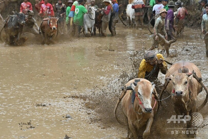 ニュース ライフ 泥を浴びてもしっぽを離すな! インドネシア伝統の牛レース 2018年12月2日 20:37 発信地:パリアンガン/インドネシア [ インドネシア アジア・オセアニア ] このニュースをシェア ‹ › ❮ 18/21 ❯ インドネシア西部スマトラ島のプリアンガンで行われた伝統の牛レース「パチュジャウィ」(2018年12月1日撮影)。(c)ADEK BERRY / AFP 画像作成中 ! 【12月2日 AFP】インドネシア西部スマトラ(Sumatra)島のパリアンガン(Pariangan)で1日、泥だらけの水田を駆け抜ける、100年の歴史を誇る伝統の牛レース「パチュジャウィ(pacu jawi)」が行われた。 米の収穫を終えた田んぼで、牛車に乗り込んだ参加者たちは、2頭の牛のしっぽをつかんで立ったまま約250メートルを疾走。優勝者には1500万ルピア(約12万円)相当の牛1頭が贈られる。(c)AFP ライフ 一覧へ> メディア・報道関係・法人の方向け 写真・動画 購入のお問合せ>